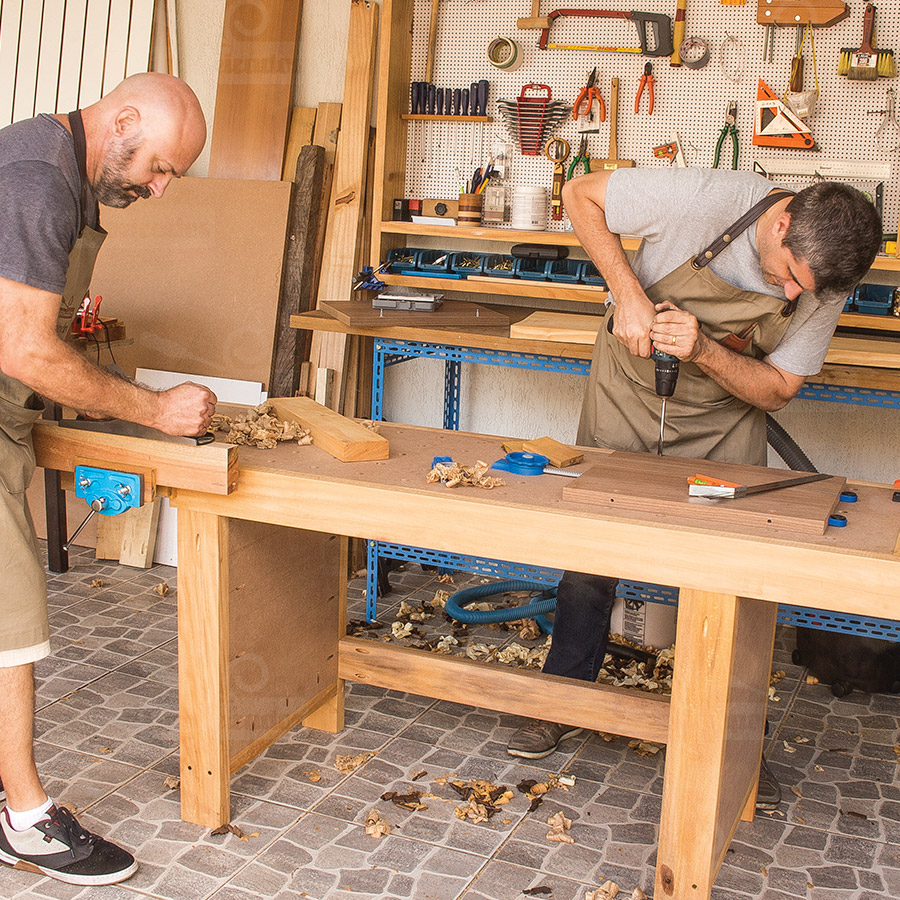 Ideal para marcenarias, oficinas e espaços de hobby. O tampo com furações de 3/4” permite o uso de grampos, gabaritos e acessórios “Bench Dogs” para fixação prática das peças. Pode ser adaptada conforme o tamanho do seu espaço e tipo de madeira disponível.