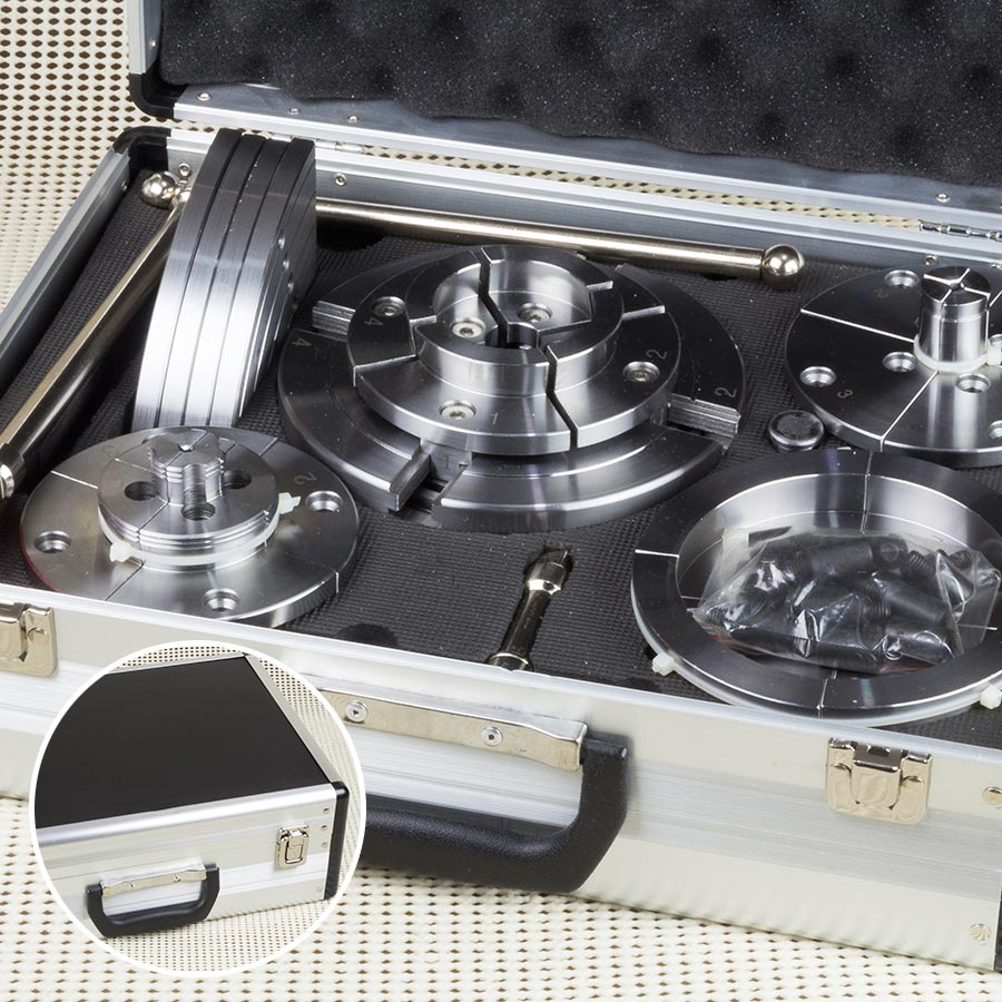 Esse kit de placa possui 5 tipos de mordentes diferentes para maior liberdade criativa na usinagem de peças em madeira. Destaque para a placa lisa muito útil para prender peças com perfil baixo tais como pratos e vasilhas.